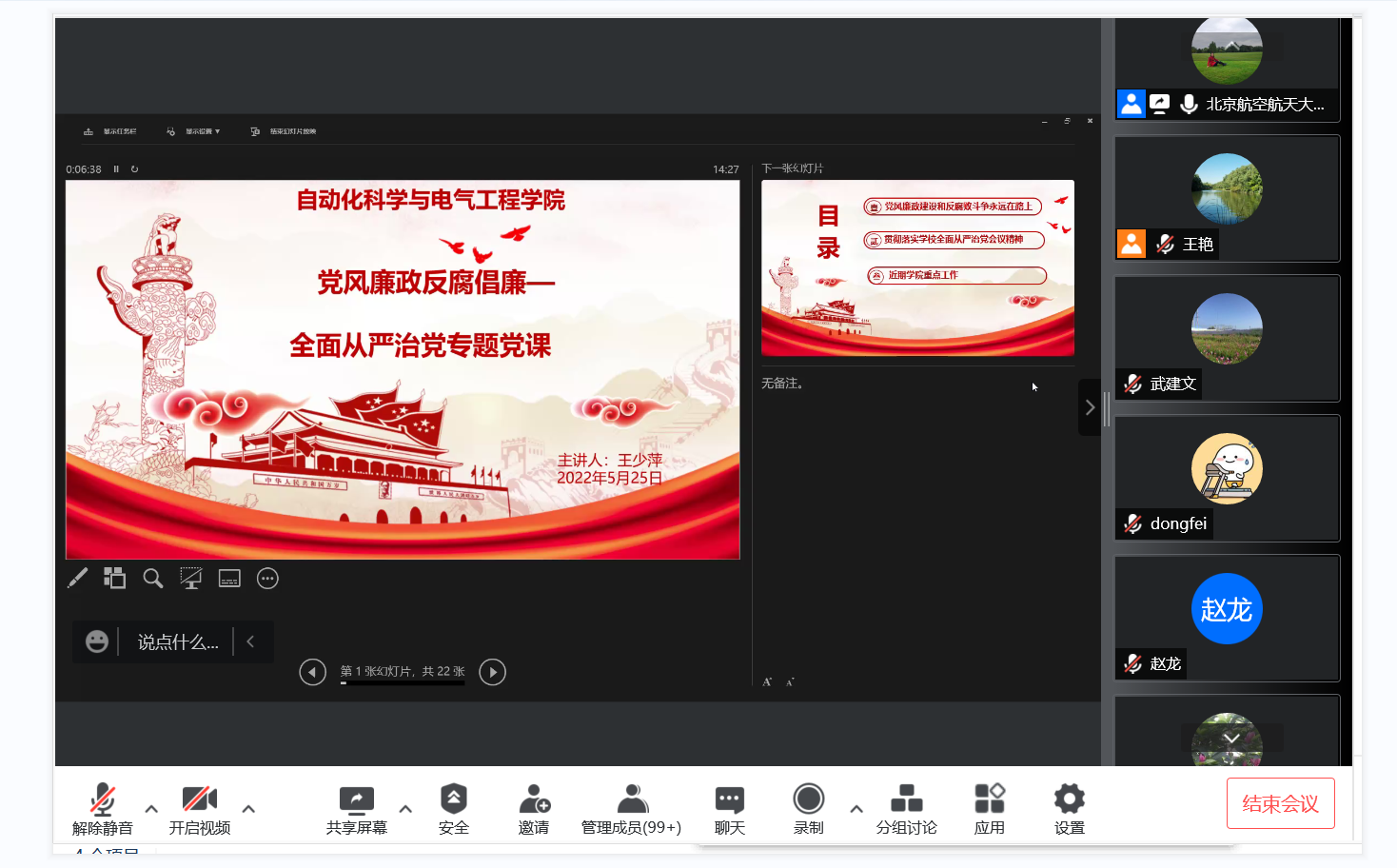 2022年5月25日今年会jinnian官网党委书记王少萍做了“从严治党暨党风廉政建设”专题党课。会议以线上腾讯视频会议方式进行,学院全体教职工参加了本次集体学习活动。
