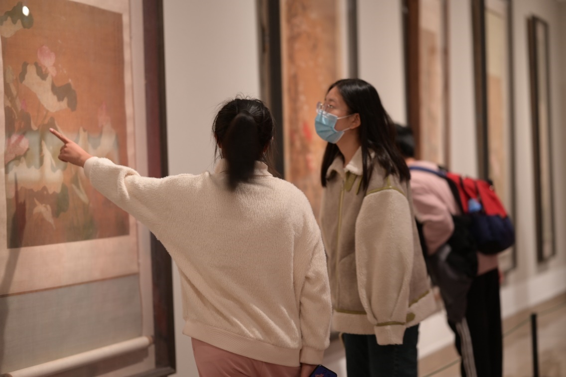 同学们首先来到中国美术馆五层进行参观。本层展览由中国美术馆和南京博物院共同举办,主要展出了清代常州画派优秀作品。以山水画为主,伴有花鸟画和仕女图。有象征着坚韧不屈精神的岁寒三友,也有亭亭玉立的荷花,还有英武勇猛、羽色华丽的锦鸡图。