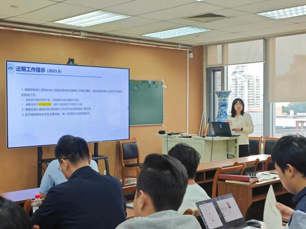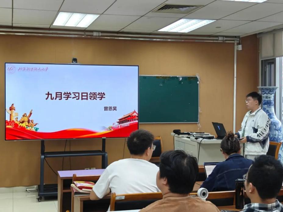 2024级硕士第一党支部支部书记曾恩昊带领与会人员开展九月学习日活动,进行理论学习环节。重点内容包括“习近平总书记重要指示精神:锲而不舍落实中央八项规定精神,推进作风建设常态化长效化”、“纪念中国人民抗日战争暨世界反法西斯战争胜利80周年大会”等。理论学习内容丰富、主题鲜明,引导各位党支部书记进一步筑牢思想根基,将理论学习成果转化为推动支部建设的实际行动。