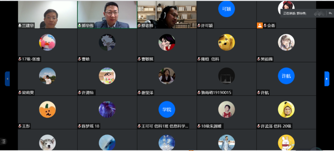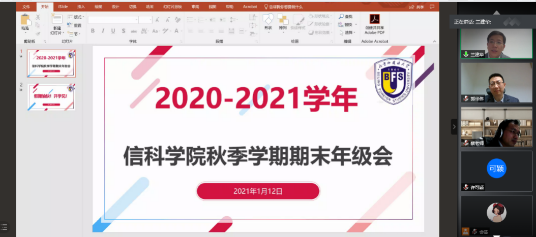 2021年1月12日信息科学技术学院举行线上秋季学期期末年级会信息科学技术学院院长蔡连侨、党总支副书记(主持)郭华伟、党总支副书记兰建华、辅导员邓会荟以及学院全体学生参加此次会议会议由兰建华主持。